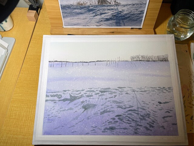 【水彩画】初の雪景色、リフティング技法 2024年02月28日 21:00 リフティングの課題で雪景色雪景色ってどう描くんだろうと未知の世界でしたが、驚くほど色付けるんですねベースの色を塗った後、このリフティング液を塗って乾かしその上に色塗って乾かした後に霧吹きで濡らしてティッシュオフWinsor&Newton リフティング・プリパレーション 75mlWinsor & Newton 結構な回数繰り返しましたが、なかなか難しいまだ途中ですがこんな感じ結構な紫雪原でも日中見てみると雪原じゃないですかーーー♪夜の照明下の色ってこんなに違うんですねこれ上手く仕上がったら教室展に出しちゃお 「水彩画」カテゴリの最新記事 < 前の記事次の記事 > コメント コメントフォーム 名前 コメント 記事の評価 リセット リセット 顔 星 情報を記憶 コメントを投稿する