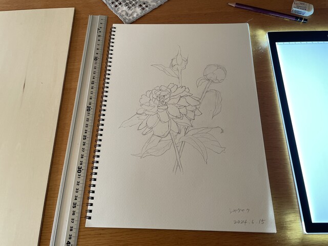 サイズを決めて描くとマットも額も使いまわしがきくので節約になります。